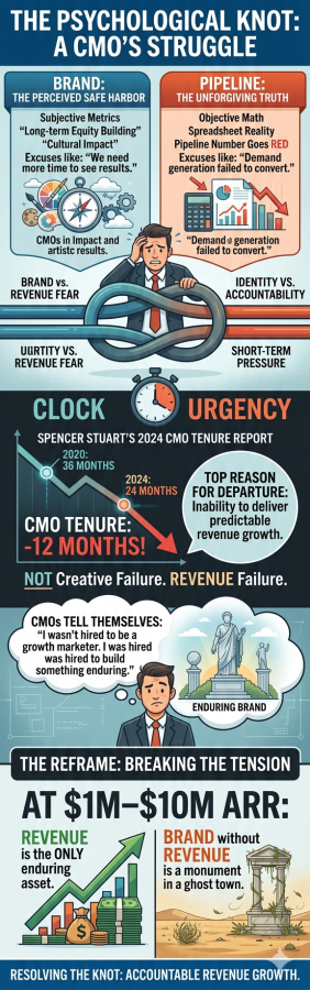 According to Spencer Stuart’s 2024 CMO Tenure Report, the average CMO tenure at high-growth SaaS companies is now 24 monthsโdown from 36 months in 2020. The top reason cited for departure? “Inability to deliver predictable revenue growth.”